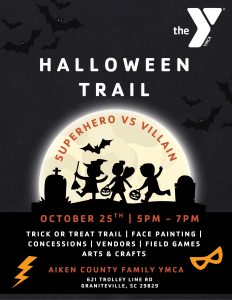 Join us for our annual Halloween Trail on Saturday, October 25th from 5-7pm at the Aiken Co. Family YMCA. We will have our trick or treat trail, face painting, concessions, arts & crafts, field games, and various venders!