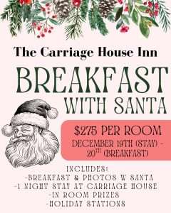 Join The Carriage House Inn for Breakfast with Santa! Enjoy in-room prizes, holiday stations, photo time slots, elves, and MORE! You don’t want to miss this unforgettable opportunity.