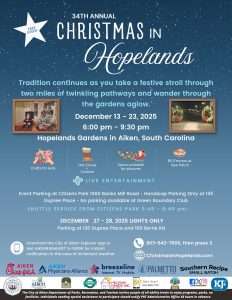 Join us for one of Aikenβs most beloved holiday traditions as Hopelands Gardens transforms into a sparkling winter wonderland filled with over 100,000 twinkling lights and more than two miles of illuminated pathways.