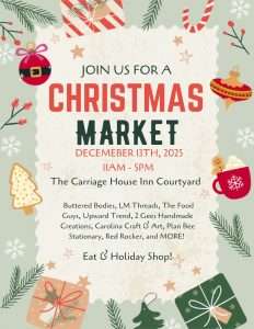The Carriage House Inn will be hosting Vendors to help with your holiday purchases! Join us in the courtyard to eat and browse local creations! 🎁
