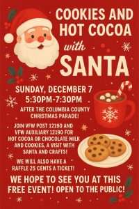 After the Columbia County Christmas Parade, swing by VFW Post 12190 (4290 Triangle Industrial Dr, Evans) for a cozy evening of holiday cheer!