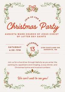 You may then enter the church and appetizers will be served from the kitchen, and you can mingle with our ward family until everyone has had a chance to drive though the nativity. Dinner will then be served. Please bring a dish to share if you are able, as it will be potluck-style.