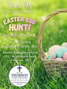 You’re invited to join us for a community Easter Egg Hunt. Enjoy dessert, pictures with the Easter Bunny, and hunt for eggs in the pecan orchard. The hunt begins promptly at 2:45 pm! See you there!