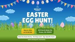 Join us for an Easter Egg Hunt after church on Palm Sunday! We will have a hot dog lunch for the whole family followed by age-specific egg hunts on the front lawn! You can get a photo with the Easter bunny and learn how to make a cross from a palm branch.