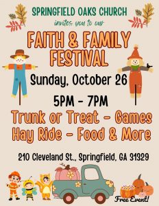 Join us for our Faith & Family Festival—Trunk or Treat. Bring the whole family for a family-friendly Trick or Treat, games, a hay ride, food, and more!