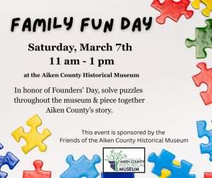 Join us on Saturday, March 7 from 11 am to 1 pm for our free, monthly Family Fun Day. This month’s theme is Aiken County’s founding, which occurred on March 10, 1871.