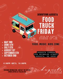 Get ready for a delicious evening in the heart of downtown Augusta at Food Truck Friday. Hosted at the Augusta Common, this popular event brings together a vibrant mix of local food trucks offering everything from savory eats to sweet treats. In addition to a wide variety of food, guests can enjoy live music and a dedicated kids zone, making it the perfect outing for families, friends, and food lovers of all ages. Whether you’re coming for the flavors, the fun, or just a relaxing night under the city lights, Food Truck Friday is the place to be.