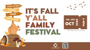Mark your calendars—because Friday, October 31st, 2025, Cornerstone Assembly is hosting one of the most exciting family nights of the year! Our “It’s Fall Y’all Family Festival” is happening from 6–8 PM at 3633 Peach Orchard Road, and you won’t want to miss it.