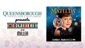 Join us on Sunday, March 8, 2026 for a FREE showing of Matilda — part of the Queensborough National Bank and Trust presents Movies at the Miller series. Tickets are free but should be reserved in advance.