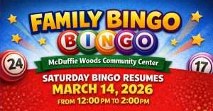 Family Bingo is returning to McDuffie Woods Community Center beginning March 14, 2026. The program will be held on the second Saturday of each month from 12:00 PM to 2:00 PM. Upcoming dates include March 14, April 11, May 9, June 13, July 11, August 8, September 12, October 10, November 14, and December 12.