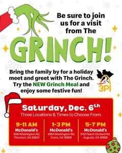 Join us this Saturday, December 6th, at our Thomson, Townecenter, and Peach restaurants to meet the Grinch, snap some festive photos, and enjoy the NEW Grinch Meal. We hope to see you and your family there!