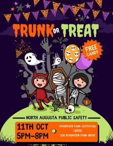 The North Augusta Public Safety Trunk or Treat will be held on Saturday, October 11th, 2025, from 5-8pm at Riverview Park. As always, this event is free to the public. Anyone interested in participating or anyone who has questions can contact Lt. Hultman at whultman@northaugustasc.gov