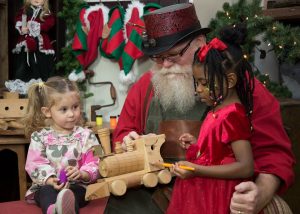 Get your photo taken and emailed; two poses, one straight on, and one action shot (painting a toy, building a toy, whispering in Santa’s ear, etc) Photos will be emailed to you. Cost is $25 per family.