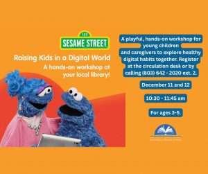 and caregivers to explore healthy digital habits together. Register at the circulation desk or by calling (803) 642 – 2020 ext. 2. For ages 3 – 5.