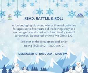 A fun engaging story and winter themed activities for ages up to five years old. Following storytime we can get you started with free developmental screenings. Sponsored by Help Me Grow S.C.
