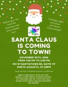 Santa is making a stop at The Splatter Place in North Augusta and is bringing the Snow Queen and Snowman to visit, too! Come visit them at The Splatter Place! Visits are FREE!!! Photos by a professional photographer (edited and emailed) are $15. Bring a donation to one of our 3 charities: Toys for Tots, Project Lifting Spirits, or North Augusta Pet Food Bank and get a Splatter Place Golden Ticket worth awesome discounts and freebies!