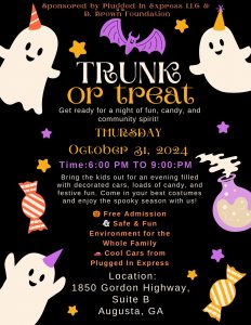Welcome to the D.Brown Foundation Inc: Trunk or Treat event! Get ready for a spooktacular evening filled with treats, and fun for the whole family. Join us on Thu Oct 31 2024 at 8250 Gordon Hwy suite C starting at 6:00 PM until 9:00 PM. Come dressed in your best Halloween costume and enjoy trunk-or-treating with our community. Don’t miss out on this exciting event! We can’t wait to see you there!