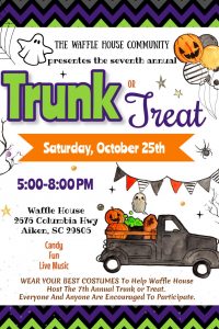 Waffle House is hosting the 7th annual trunk or treat. Location will be at the Waffle House located on Hwy #1 right off of exit 22. EVERYONE is invited to enjoy all the fun and ANYONE is welcome to participate. The more participants = more fun for the kids !!! All Waffle House family will be there. Hwy #1, Hwy #19, and York st. Along with others who love to participate in the Halloween fun. SPREAD THE WORD. Share everywhere and invite everyone.